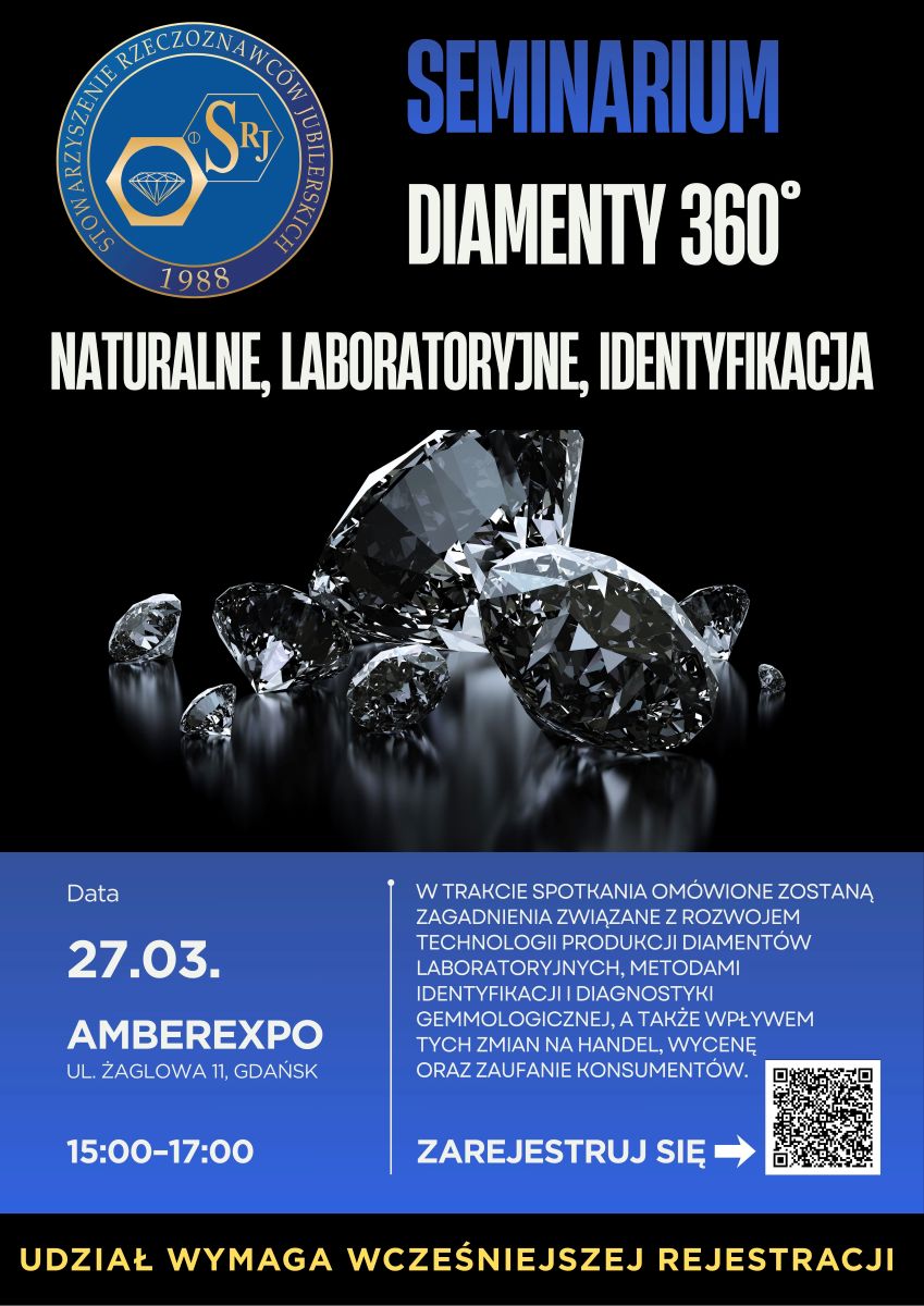 27 березня 2026 року в Гданську, в рамках Міжнародного ярмарку бурштину та ювелірних виробів AMBERIF Spring відбудеться семінар «Діаманти 360° : природні, лабораторні, ідентифікація» , організований Асоціацією оцінювачів ювелірних виробів.